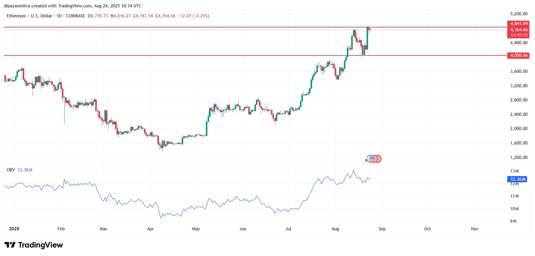 As mentioned earlier, the king of altcoins, Ethereum (ETH), has managed to sustain its price above the $4,000 mark for an extended period, signaling strong bullish momentum. At the time of writing, ETH was trading at $4,772.75, boasting an impressive market capitalization of more than $576 billion. This surge comes on the back of a remarkable 30% price increase in the past month, further fueling optimism among investors and market participants.