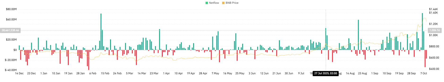 On-chain data backs this up. In just two days, roughly $51 million in BNB has left spot exchanges. The pattern is clear: traders are moving tokens out, likely locking in gains from the recent top.