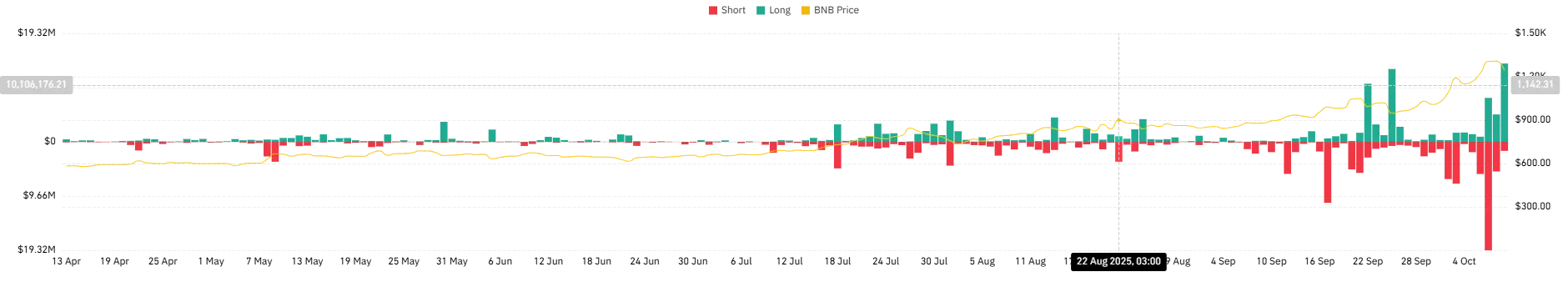 The volume bar chart reinforces the sell-side pressure building in BNB’s price action, as its red candles are expanding following the recent price dip. This validates what many traders refer to as a distribution zone, a type that forms when early buyers begin taking profits.