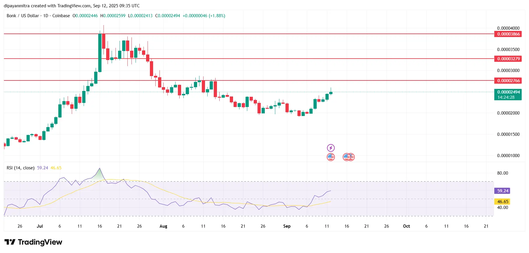 • Key resistance levels: $0.000027, $0.000032, and $0.000038 before BONK’s potential surge.