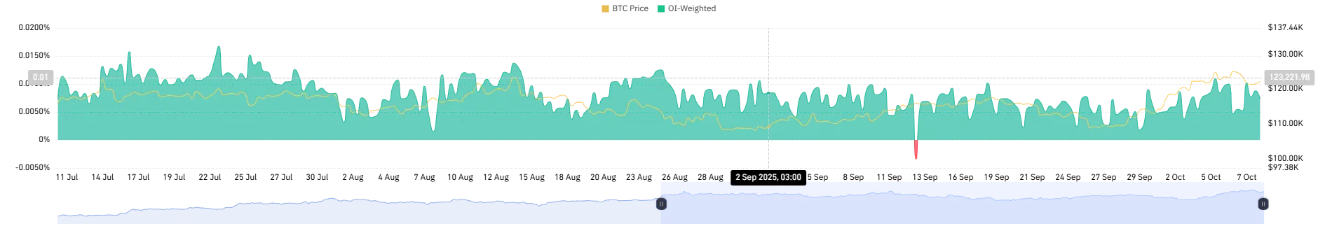 Bitcoin traders are holding their ground, as market data clearly shows. The funding rate, weighted by open interest, has stayed in positive territory at about 0.0074%. That means long holders are paying short sellers to keep trades open, a sign that optimism remains strong and that many still believe the price has room to climb.