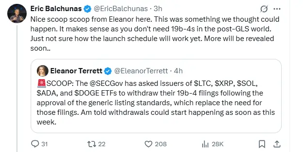 Even as analysts weigh the impact of a shutdown, the SEC has moved to streamline the ETF process. Fox Business journalist Eleanor Terrett reported that the Commission directed issuers of Litecoin, XRP, Solana, Cardano, and Dogecoin ETFs to withdraw their 19b-4 filings.