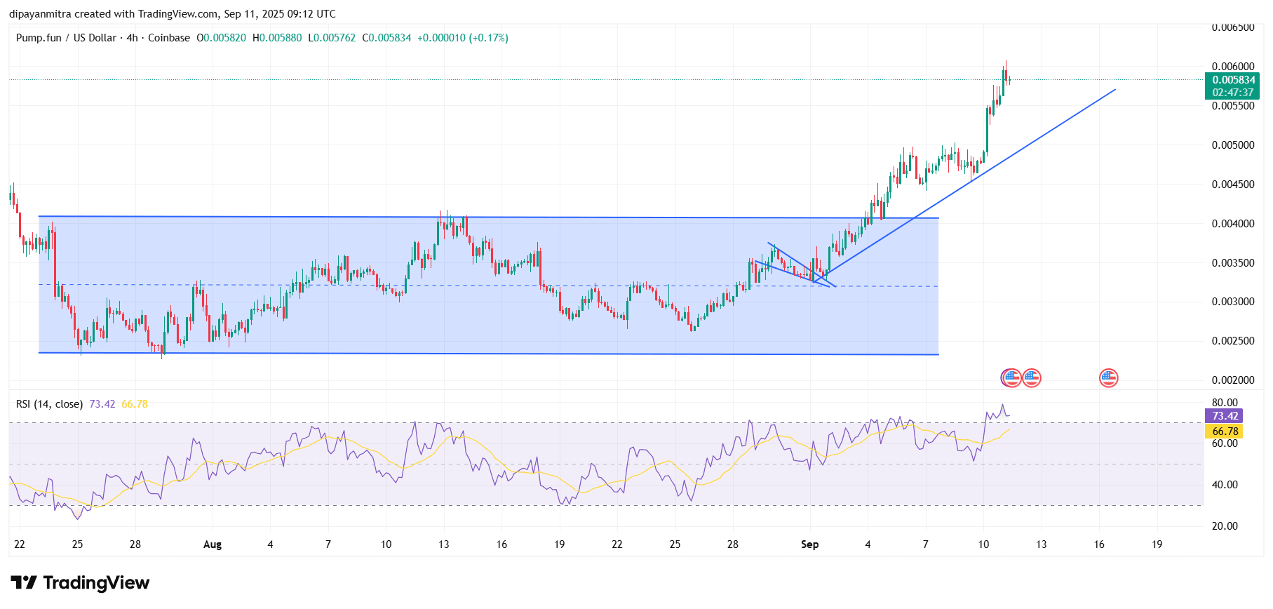 A closer look at the 4-hour chart of Pump.fun by CryptoMoonPress reveals several key bearish factors preceding this rally. PUMP, after a severe drop in recent weeks, managed to stabilize its price into a parallel channel for months of strong consolidation. This consolidation has served as a base to provide fresh bullish momentum, thus keeping it from any further danger of downward pressure.