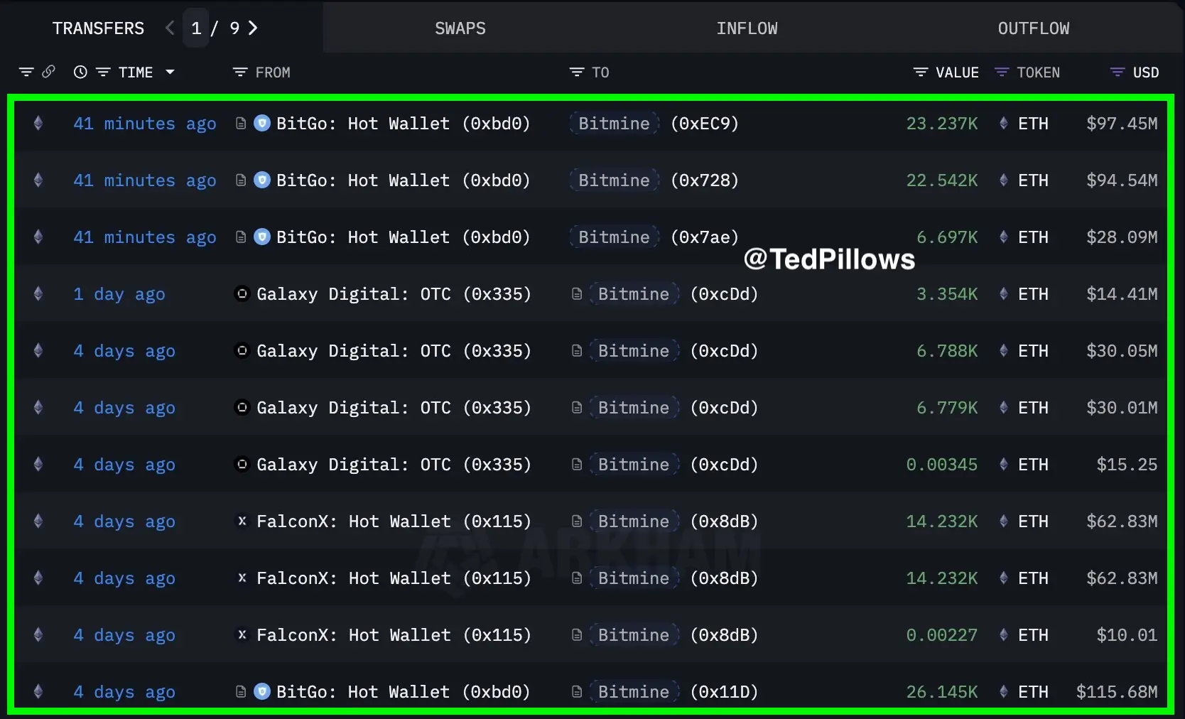 The latest batch of inflows included three standout transactions—23,237 ETH worth $97.45 million, 22,542 ETH valued at $94.54 million, and 6,697 ETH totaling $28.09 million. Analysts underscored that these movements represent one of the most aggressive single-day acquisition streaks by Bitmine in recent months.