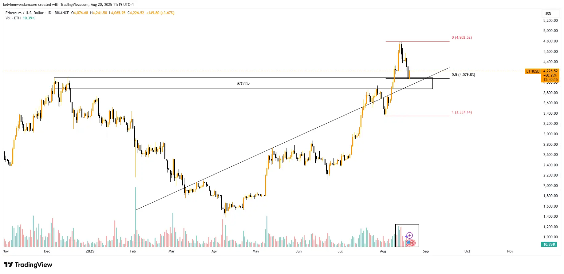 The ETH price is making waves once again, having taken a calculated pullback that is now the center of discussion among market participants and whale circles. Having surged almost 40% from August lows of $3,357 into a local high of $4,793, ETH has since dropped about 13%, currently holding above $4,200, right after bouncing off the 0.5 Fibonacci retracement level.