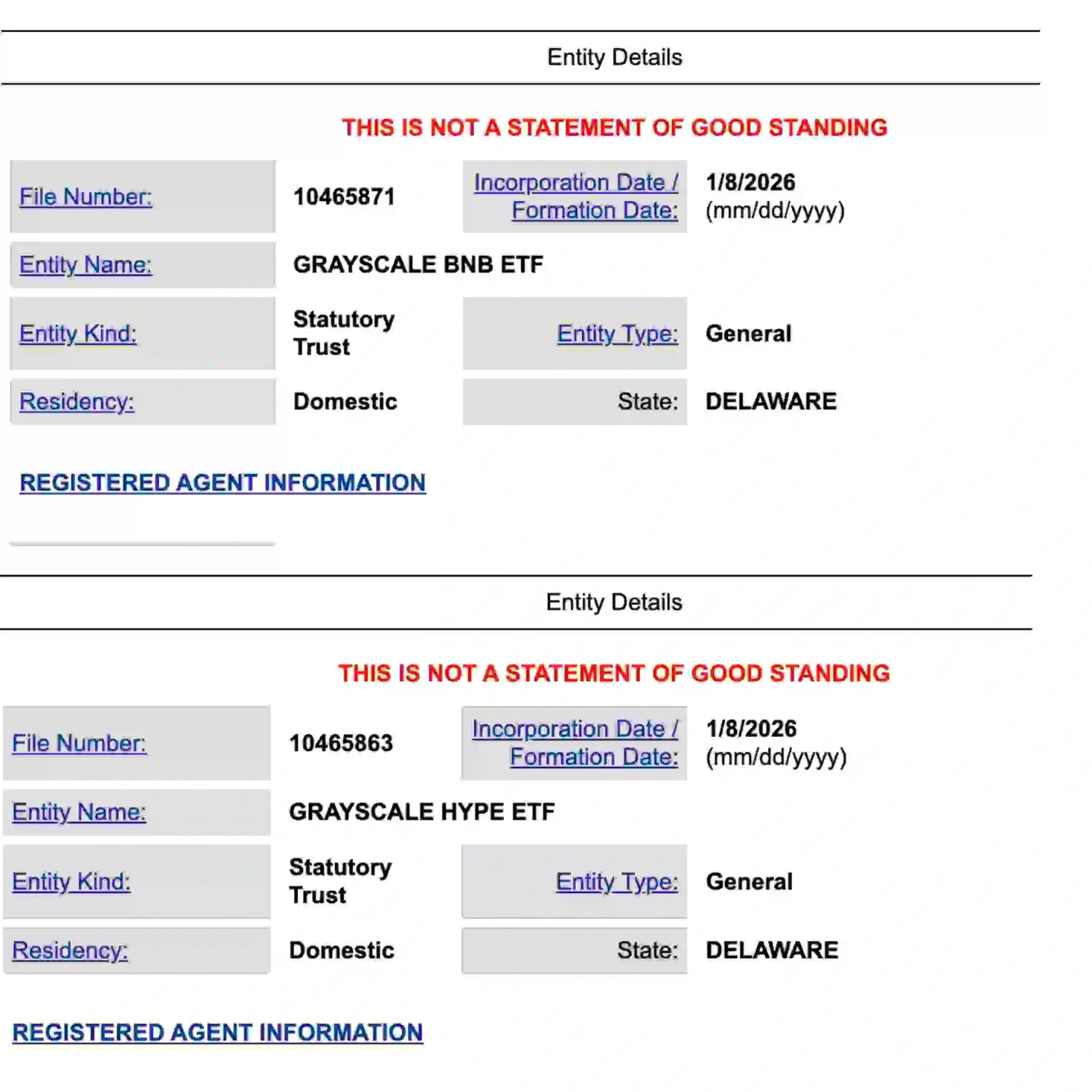 According to records from the Delaware Division of Corporations, Grayscale registered the Grayscale BNB Trust under file number 10465871 and the Grayscale HYPE Trust under file number 10465863 on January 8. This step is common across the ETF industry, particularly for crypto-linked products that require a clear legal structure before federal review.
