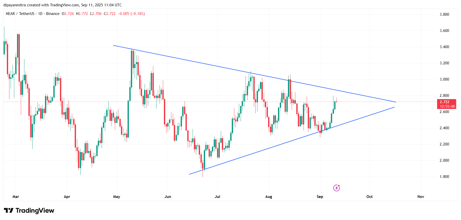 NEAR Protocol’s price chart revealed yet another important technical formation, an aspect CryptoMoonPress found particularly interesting to note. Dating back to the May of 2025, NEAR has been developing a symmetrical triangle pattern, which is widely celebrated as a setup that triggers huge rallies on a confirmed break above the upper trendline. With the pair coming down onto converging support and resistance levels, the pattern signifies consolidation of price-alongside-waiting to see which direction the market will move heaviest next.
