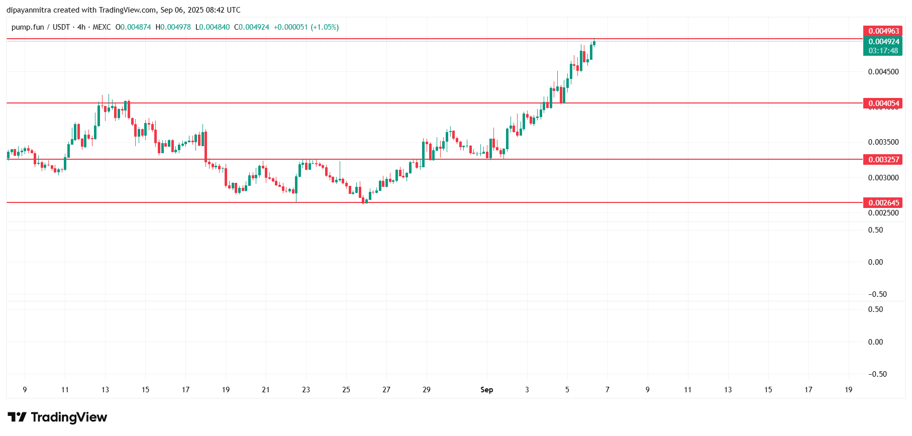 On Pump.fun’s 4-hour chart, the token witnessed a strong rejection at the $0.0049 resistance level lately, indicating that bullish momentum may be losing steam. This rejection is very significant for technical analysis, since such a level often signals a little time when buyers begin to lose control and sellers begin to set downward pressure.