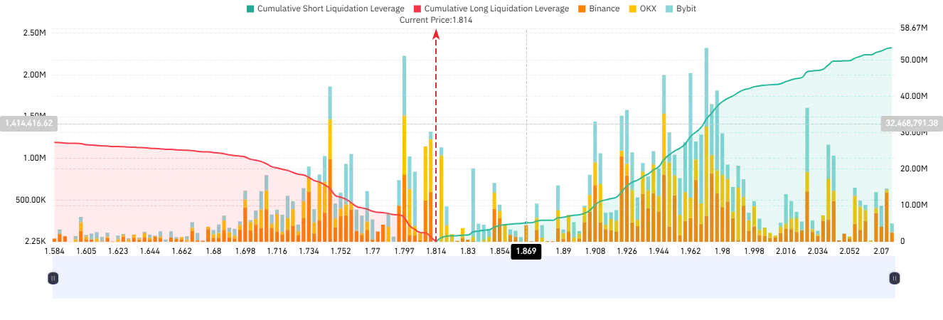 However, near-term risks remain. The liquidation map highlights a cluster of long positions worth $9 million positioned around $1.797. This zone could trigger a controlled retracement, often described by analysts as a “healthy reset,” designed to shake out weaker hands before the next leg higher.