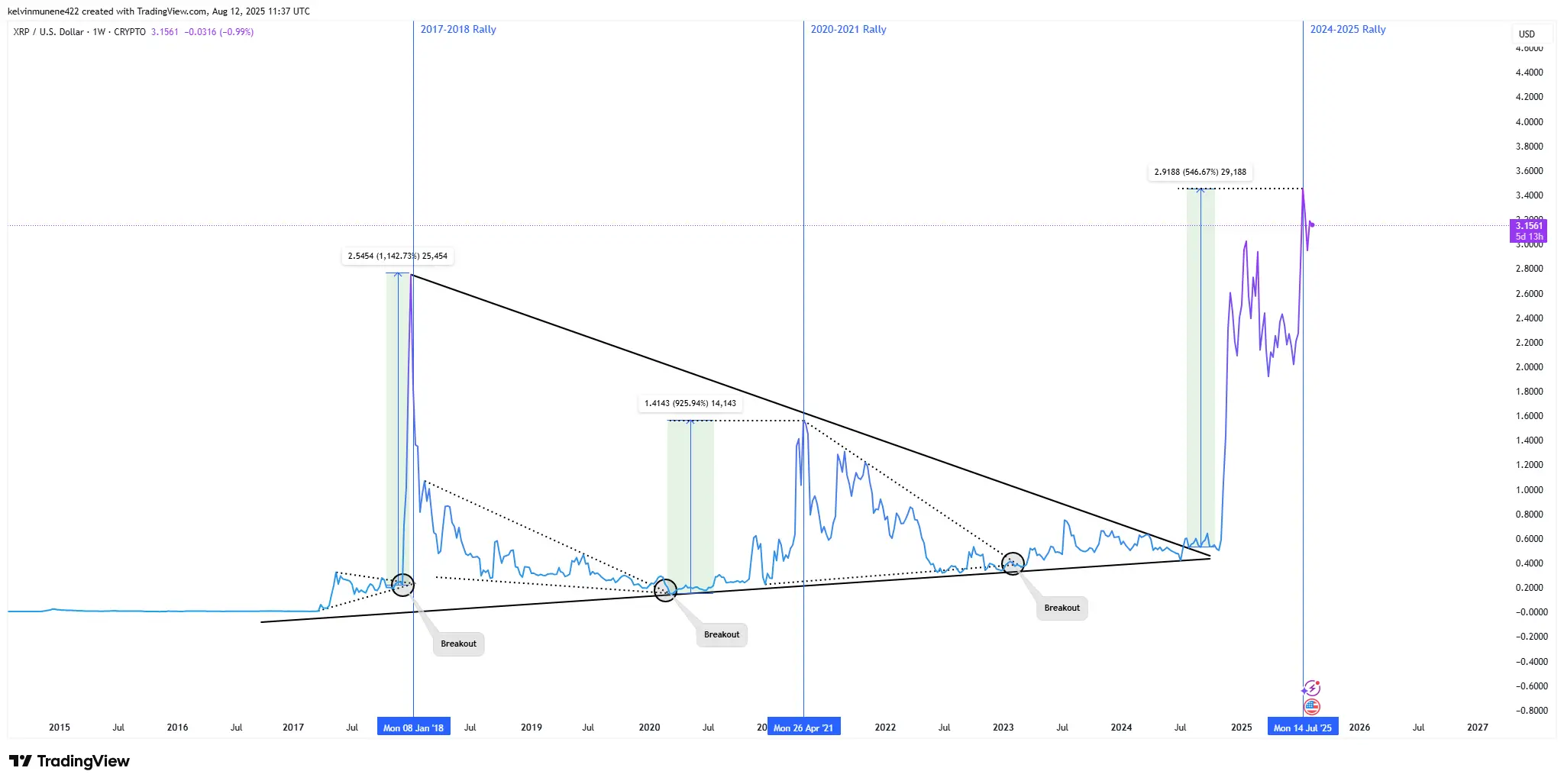 In the 2017–2018 cycle, for instance, XRP traded within a symmetrical triangle before breaking out in late 2017. The move triggered a rapid surge exceeding 1,140%, pushing prices above $3.30. A similar setup unfolded between 2018 and 2020, where an extended consolidation ended in mid-2020.