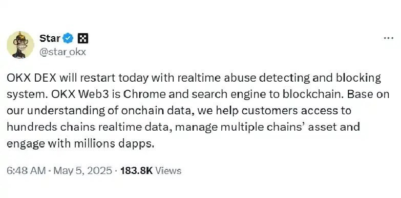 OKX CEO Star commented on the relaunch via social media, emphasizing the platform’s commitment to transparency and security. “OKX DEX will resume today with real-time anti-abuse detection and blocking systems,” he wrote. “OKX Web3 is the Chrome browser and search engine connecting to the blockchain. Our platform enables users to access and interact with real-time data from hundreds of blockchains and thousands of dApps, while managing assets across multiple chains.”
